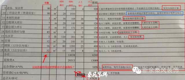 一般施工隊在每項報價后面會注明是用什么材料及施工工藝,比如墻面漆30元/平方米,應(yīng)注明對于墻面基層的處理工藝,如刮幾遍膩?zhàn)诱移?,乳膠漆的品牌型號及涂刷工藝,如刷前加一遍底漆及乳膠漆加水的百分比和滾涂遍數(shù)等。還有一些額外的預(yù)算,報價的時候一定要提前告知業(yè)主,比如墻面底基找平處理,地面找平等,還有瓷磚規(guī)格過大或過小,都要加錢的,這些收費(fèi)項目施工方都應(yīng)提前告知業(yè)主或者有備注說明,如果在預(yù)算中不寫上,到現(xiàn)場施工時才提出來,面對突然多出來的費(fèi)用,一般業(yè)主會難以接受。